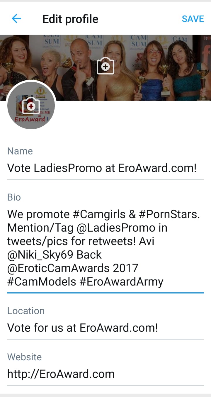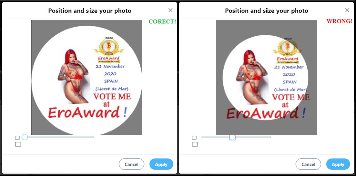 The adult oriented pictures and videos with our tshirts are uploaded to the Adult Social Networks, like for example xHamster: xhamster.com/users/EroAward/photos Avatars For twitter, facebook profiles or pages, instagram, adult social networks, camsite profile. 845 X 916 pixels. Make sure that you center well the image inside of your avatar and that you catch your image and also our EroAward logo, as well as "Vote me at EroAward!". Note: We know the correct form is "Vote for me!", but we use "Vote me" where we have little space, like in a cam profile or twitter description, or we try to make the message visible on small areas, like an avatar. (Right click mouse and "Save as..." to save it in your computer, open it with Paint or other image editor, then Copy & Paste 1 of your pictures on the Left. DON'T use naked pictures for Twitter/Facebook/Instagram, as it doesn't allow nudity in avatars or background! You can use nudity in avatars or background only on adult social media like the porn tubes. Preferible to use a picture made on a white background, to better distinguish your body, and a vertical one to better fit in the avatar.)