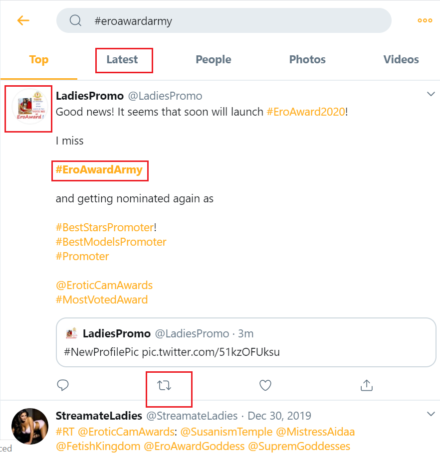 Don't cross the twitter limits Read about twitter limits and comply. Shadowban & Twitter Groups for Retweets "Shadow banning is the act of blocking or partially blocking a user or their content from an online community such that it will not be readily apparent to the user that they have been banned. For instance, shadow banned comments posted to a blog or media site will not be visible to other persons accessing that site from their computers." Many adult experts on twitter promo believe that the majority of the adult accounts on twitter are shadowbanned, which also explains the reduced number of retweets on many accounts with large number of followers. In order to solve this problem, the #EroAwardArmy created over 800 twitter Groups with over 40.000 stars, promoters, fans and companies, and everybody who join #EroAwardArmy Promotion System, will be automatically added also to 5 groups for retweets. Rules for the #EroAwardArmy Groups for retweets: - drop as many tweets as you want to receive retweets; - be friendly and network with the promoters & fans or other models or companies, to receive support with retweets; - it is not obligatory to follow or retweet anybody. So, follow/retweet only if/who you want. - Respect! Don't scream at others and don't put any pressure on anybody. If you have complaints or suggestions, please contact EroAward. - Don't block anybody in the group! If somebody treats you bad, please report it to us. - Don't promote other awards beside EroAward, in our #EroAwardArmy groups! - You can leave the groups whenever you want. Who doesn't respect our rules, first we issue a warning and the ones who repeat will be eliminated from our groups or even from our promotion system or EroAward nominations. #TeamOfTeams As we promised, inside of #EroAwardArmy, we work to create the Biggest Team of Promoters on the planet, and we can do this by joining forces with all the individual promoters and all the teams interested to grow together. You are a fan helping cammodels or pornstars with promo, as a hobby? You are a professional promoter or want to learn how to do it? Are you part of a team or own a team? An affiliate or webmaster? A blogger or a forum owner? JOIN US! Together, we’re much more than the sum of each! We will list here all the promoters who joined us, with all their sites and social media. Promoters market & services for Models We launched the Promoters Market & Services for Models, where the promoters (& fans) can SELL DIRECTLY their services to the models & studios who are interested (prmotion, banners design, websites building, cam moderators, etc), so make sure to register if you are interested! Twitter promoters Lists for Girls, Boys and Trans (Models & Promoters, follow and copy/paste these promoters in your tweets, or tag them in your photos/videos, to get many retweets & tweets. It is FREE advertising!) Retweets for tweets with #EroAwardArmy hashtag and EroAward Avatar Another easy way for the Promoters from EroAwardArmy to find tweets for retweets, is to search on twitter for the tweets that include hashtag #EroAwardArmy in visible place and to retweet those who also have an EroAward Avatar, something like this: The tweets who only have #EroAwardArmy hashtag and no EroAward Avatar, nor "Vote for me at EroAward!" on the top part, will not get retweets in our promotion system. The Bonus Votes The Bonus Votes are suplimentary votes that we offer for the nominees, beside the ones received from the voters, to reward those who are supporting more our EroAwardArmy. Example: Let's say that 2 nominees received the same amount of votes in one category. So, who should win the trophy? In this case, we watch also who supported more our EroAwardArmy and that helps us to make the difference: Did one of the two make also some picture with our EroAward tshirt? Or a funny/sexy/explicit video to ask his/her/their fans for votes, or to thank for the votes if was a winner? The number of Bonus votes that are offered and the conditions: - 100 votes/month extra, for each social media where the nominee asks "Vote for me at EroAward.com!" on one of the top parts (background, avatar, pinned post, etc). The number of months is calculated since the nominee starts asking for votes and until he/she stops doing it. - 300 votes/month extra, if the model asks for votes daily (40/month if weekly and 20 votes/month if at least monthly); - 150 votes/month bonus if the nominees retweets or shares us daily (30 votes/month if weakly); - 500 votes if the nominee sends us quality pictures with EroAward tshirt. (Use www.filemail.com and eroaward @ gmail. com to send us your BEST 10-15 pictures - clear, full body, sexy and erotic, horizontal and vertical). Some models can create high quality pictures on their own, but others need to pay a professional photographer. The better are your pictures for promotion, the more customers we can send to you! A good picture can get 20-50 more retweets/shares than a bad picture (unclear, only parts from the body, not nice background, not creative position, nothing interesting in the pic, etc). Please, don't write anyhting on the pictures! - 700 votes for a 3-5 minutes sexy (and funny) video (for YouTube, so no nudity!), where the nominee asks for votes at EroAward. Please, don't write anyhting on the video and don't use music (if you don't own the copyright)! - 1000 votes for the same video, if it includes nudity or is explicit (for porn tubes). Please, don't write anyhting on the video and don't use music (if you don't own the copyright)! - 700 votes for a 3-5 minutes sexy (and funny) video (for YouTube, so no nudity!), where the winner thanks his/her fans for the votes at EroAward (with or without the trophy). Please, don't write anyhting on the video and don't use music (if you don't own the copyright)! - 1000 votes for the same video, if it includes nudity or is explicit for porn tubes (with or without the trophy). Please, don't write anyhting on the video 